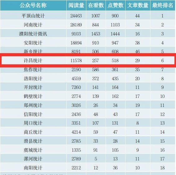 第6!“许昌统计”入选6月份河南省统计微信公众号排行榜