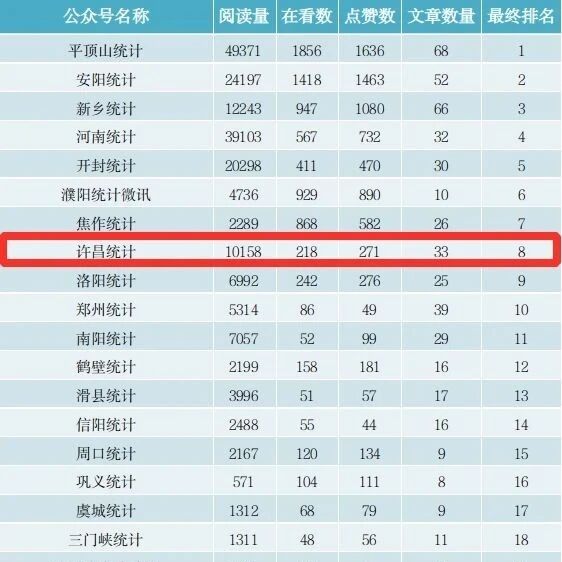 8!“许昌统计”入选5月份河南省统计微信公众号排行榜